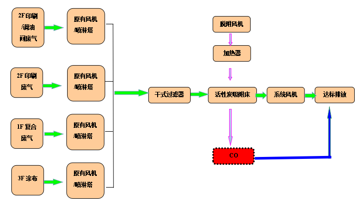 印刷排氣系統合并后處理,保持原有的噴淋塔,有機廢氣先通過干式過濾器進行預處理,預處理后進入活性炭吸附劑床進行吸附,處理后的氣體可直接達標排放。當活性炭飽和后,利用加熱的空氣作為介質,將吸附在活性炭里的有機廢氣吹脫出來,經循環后增濃,即濃縮成高濃度的廢氣后進入催化燃燒裝置,在催化劑的作用下,于200-300℃時分解成無害化的CO2和H2O后達標排放。